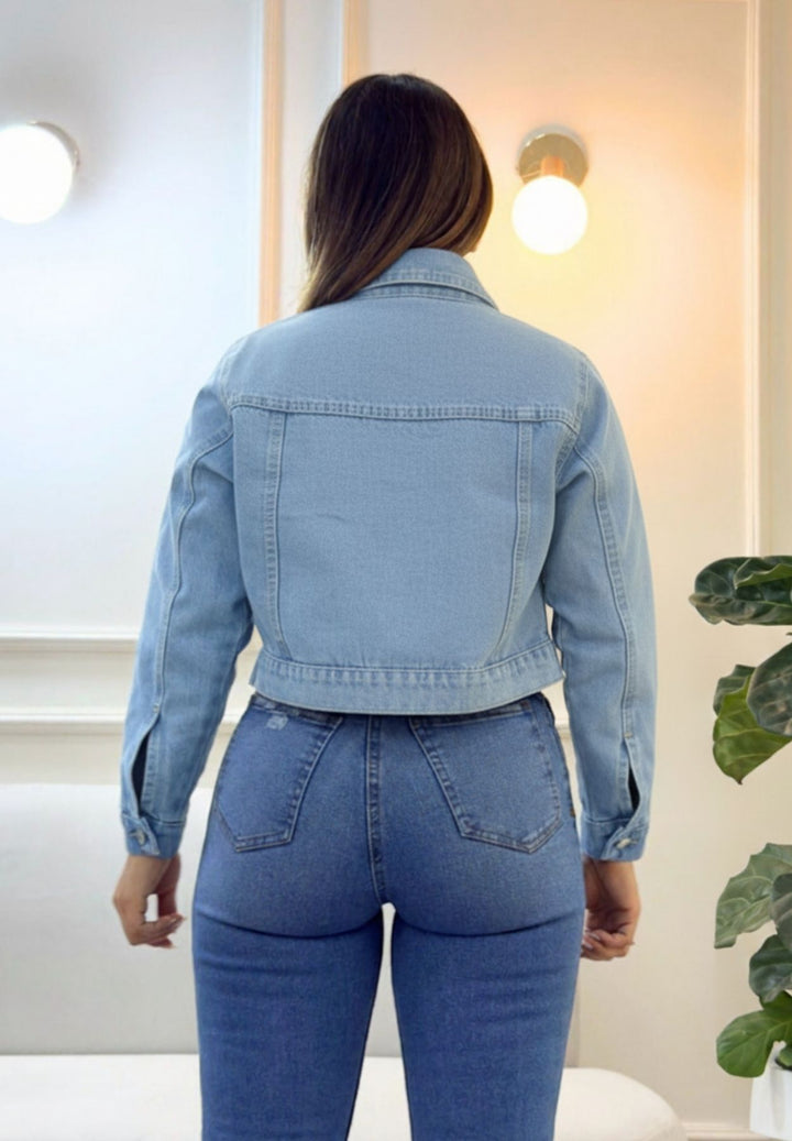 La Chaqueta Clásica en Jeans Azul Claro Rígida es una prenda infaltable en tu clóset.