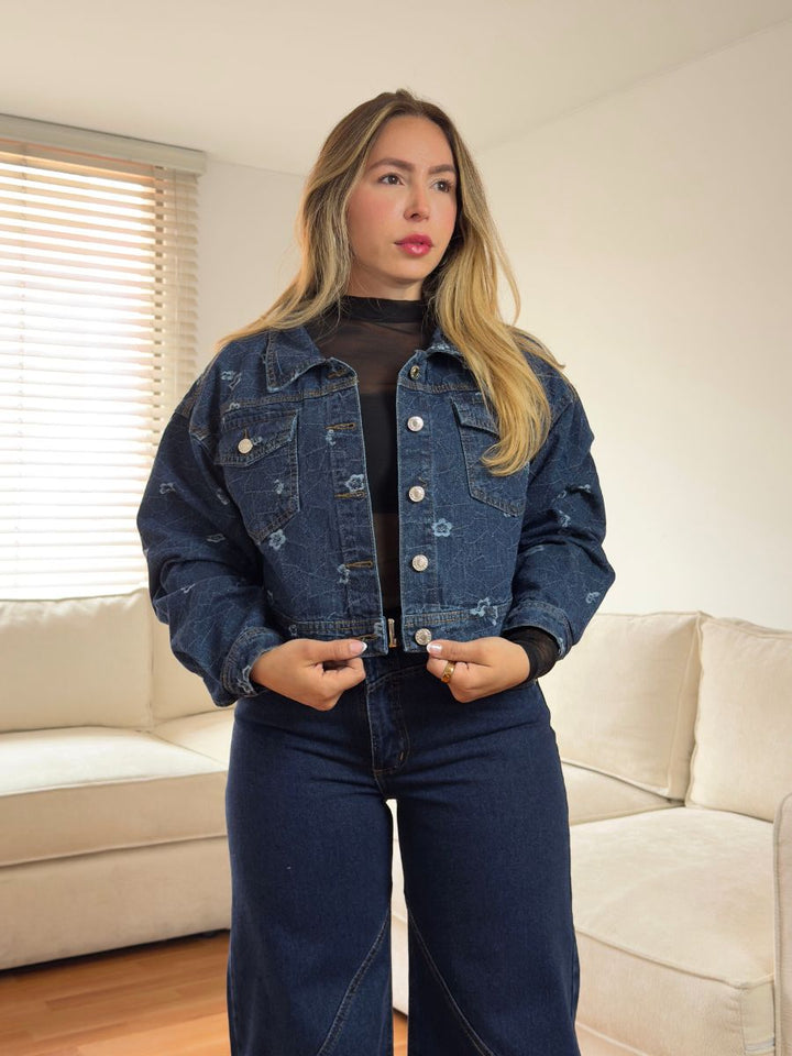 Chaqueta Oversize Azul Medio Oscuro Tejido Flores