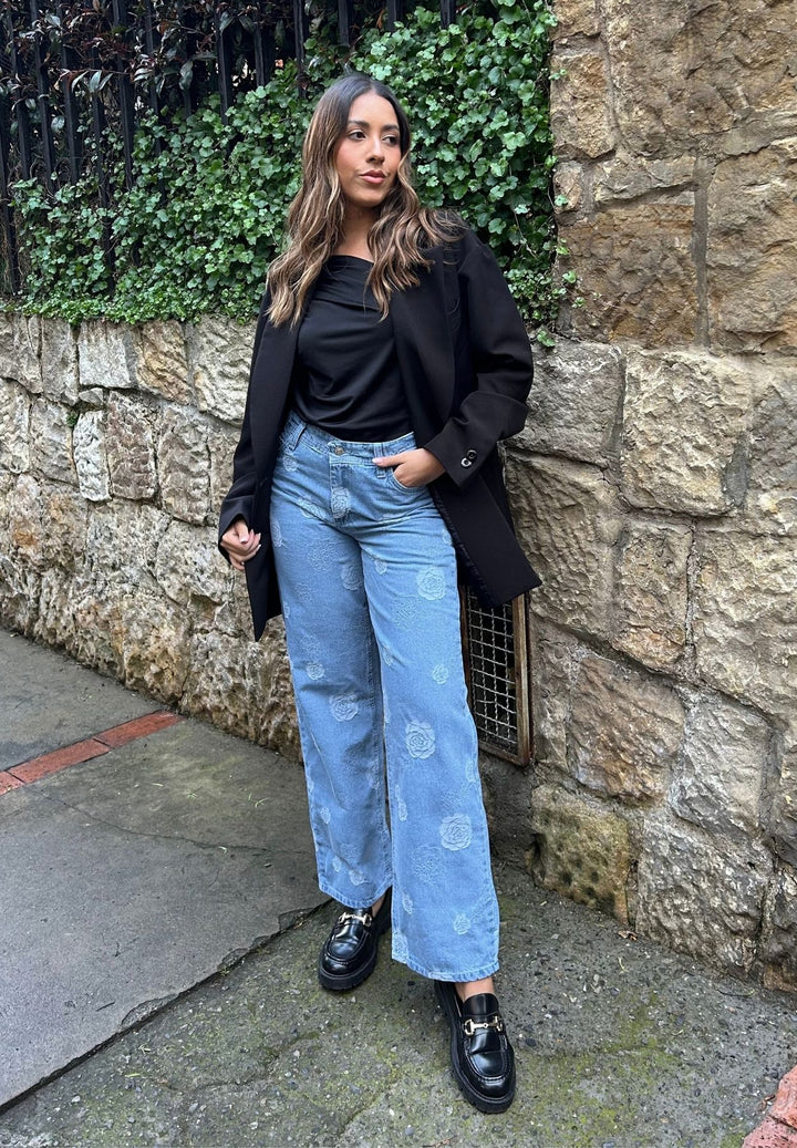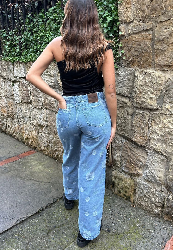 Jeans Wide Leg - Azul Claro Tejido Rosas