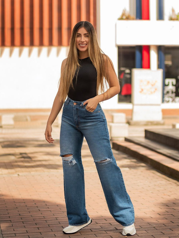 Un clásico renovado con toques rebeldes: los Jeans Wide Leg en Azul Medio con Rotos son una declaración de estilo sin esfuerzo.