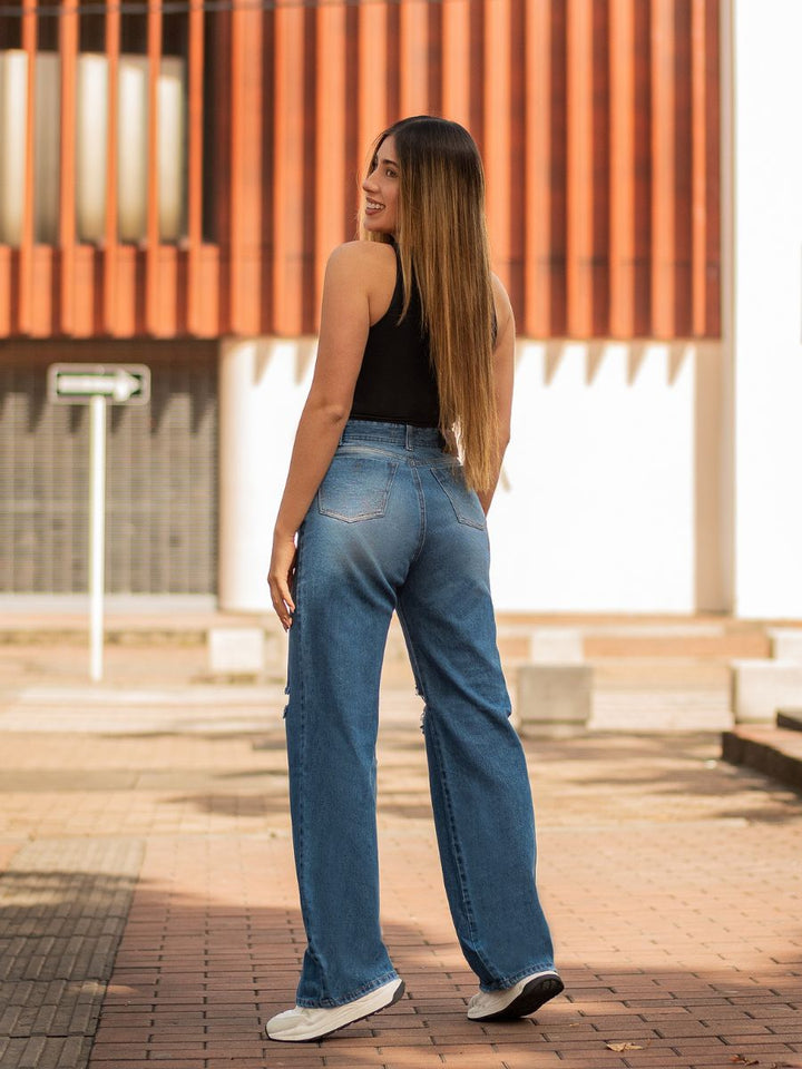 Con un diseño de pierna ancha y tiro alto, este modelo combina comodidad y actitud para que luzcas moderna en cualquier ocasión. El acabado desgastado en azul medio y los rotos estratégicos le dan ese look casual que nunca pasa de moda.